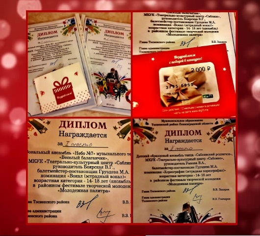 Сегодня в Никольском городском Доме культуры проходил ежегодный районный фестиваль-конкурс творческой молодежи -«Молодежная палитра» . В этом конкурсе приняли участие и наши творческие коллективы!!!! Это старшая группа «Образцового» ансамбля танца «Саблинский родничок»-руководитель группы и постановщик танца — Майя Анатольевна Груздева,художественный руководитель Вера Арсентьевна Умнова.И старшая вокальная группа -ансамбль «Небо №7» «Образцового» музыкального театра «Веселый балаганчик»-постановщики номера-балетмейстер Ксения Сергеевна Комарова и хормейстер Казырова Алина Олеговна,художественный руководитель-Вера Георгиевна Боярская. Ребята выступили очень достойно и показали настоящую сценическую культуру в лучших традициях нашего Саблино.. В итоге, оба коллектива привезли призовые дипломы!